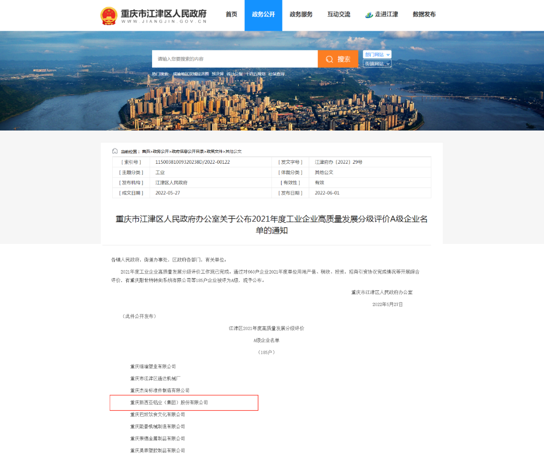 重慶新西亞鋁業(yè)(集團(tuán))榮獲“2021年度工業(yè)企業(yè)高質(zhì)量發(fā)展分級(jí)評(píng)價(jià)A級(jí)企業(yè)”。