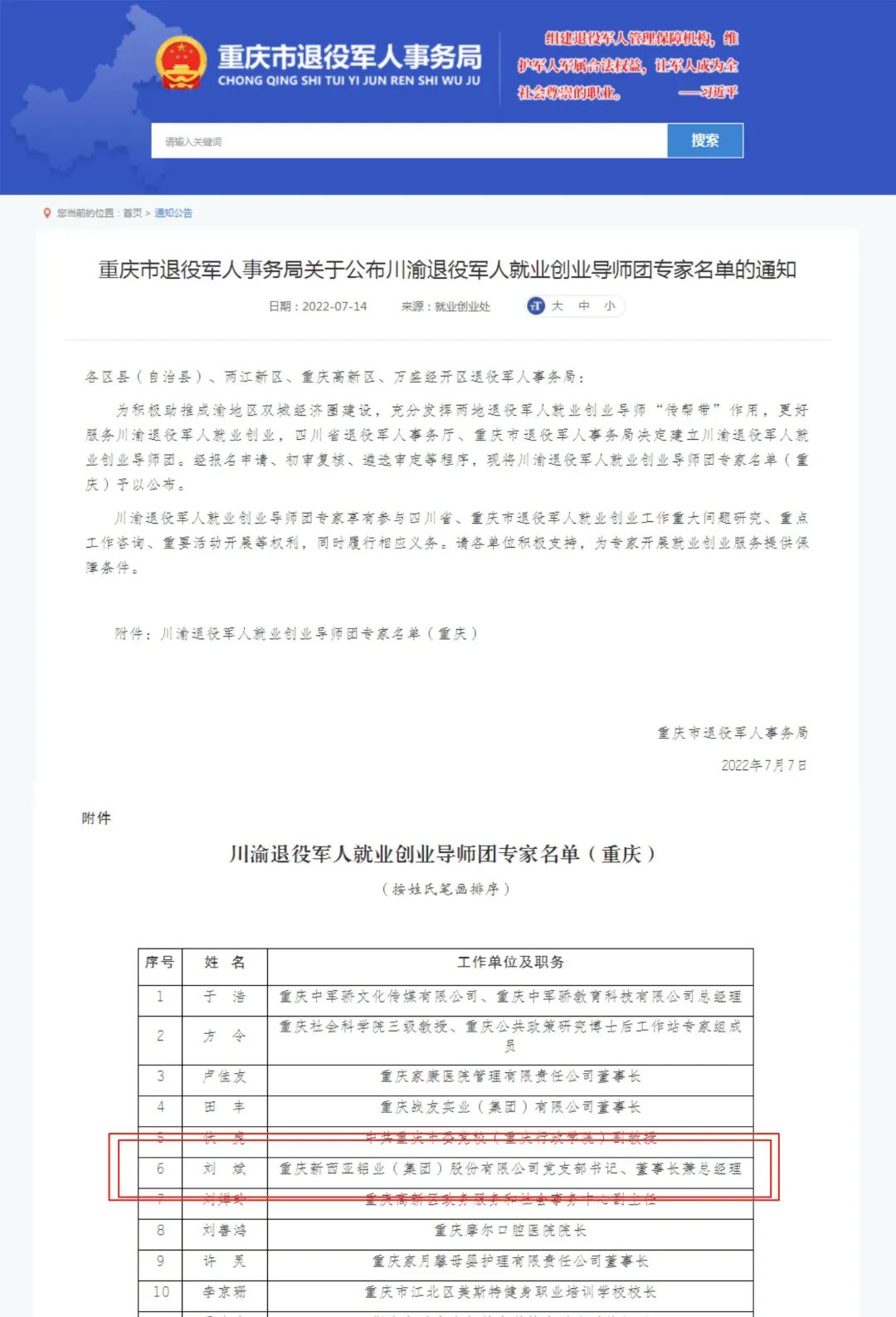 2022年7月7日,從四川省退役軍人事務(wù)廳、重慶市退役軍人事務(wù)局傳來好消息,重慶新西亞鋁業(yè)(集團(tuán))股份有限公司董事長劉斌被授予“川渝退役軍人就業(yè)創(chuàng)業(yè)導(dǎo)師團(tuán)專家”榮譽(yù)稱號。