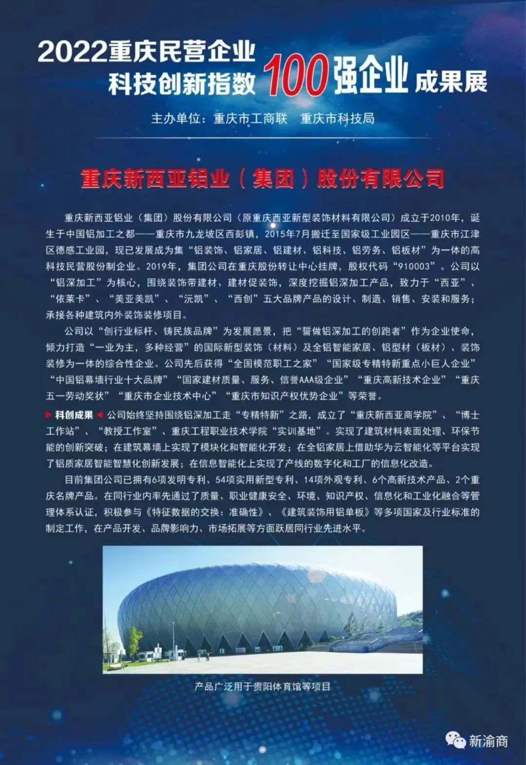 1月9日,重慶市工商聯(lián)(總商會)六屆一次常委會議、六屆二次執(zhí)委會議召開。會議發(fā)布了2022重慶民營企業(yè)科技創(chuàng)新指數(shù)百強(qiáng)企業(yè)榜單。新西亞鋁業(yè)集團(tuán)上榜“2022重慶民營企業(yè)科技創(chuàng)新指數(shù)百強(qiáng)企業(yè)”。