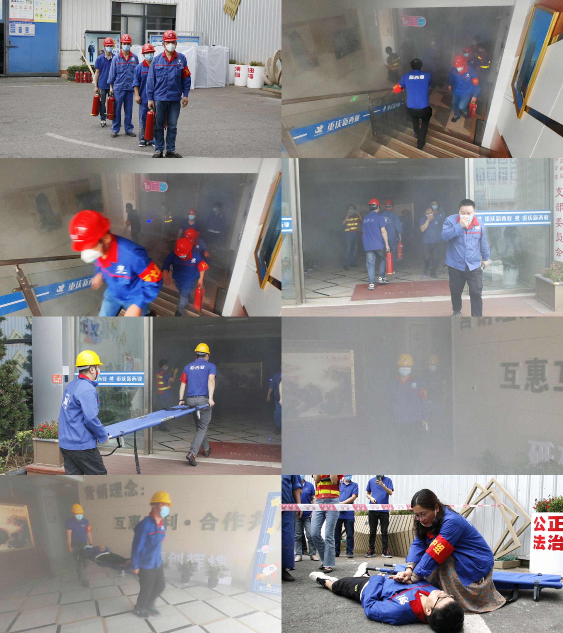 模擬演練中,疏散隊員引導(dǎo)員工用衣物或毛巾捂著口鼻有條不紊地在火情中進行緊急疏散、自救、互救、急救、護理等。消防救援組身著反光背心、手提滅火器,迅速到位,將“火”撲滅。醫(yī)療救護組迅速將“傷員”救出,用擔(dān)架將“傷員”抬至“搶救護理站”,開展傷員“黃金4分鐘緊急救治”。
