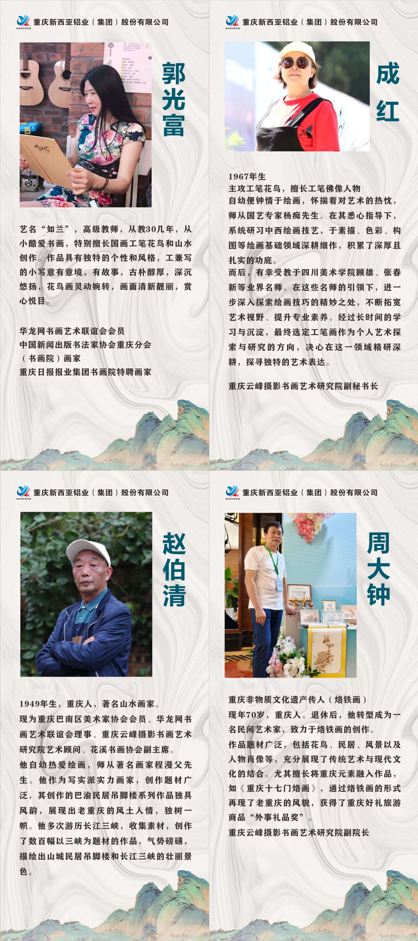 7月5日,一場墨香氤氳的文化盛宴在重慶新西亞鋁業(yè)集團成功舉辦。“翰墨飄香·文化賦能”書畫家聯(lián)誼活動由新西亞鋁業(yè)主辦,江津區(qū)德感商會協(xié)辦,特邀重慶云峰攝影書畫研究院院長何先友率領十余位書畫名家走進新西亞,與德感商會企業(yè)家代表齊聚一堂,共話藝企情緣,共譜文化新篇。