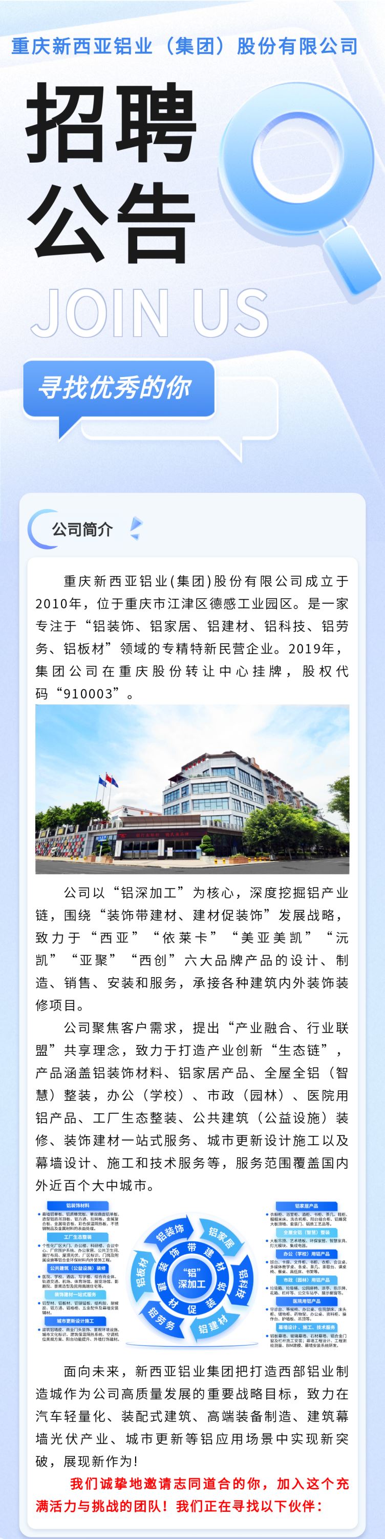 重慶新西亞鋁業(yè)(集團(tuán))股份有限公司:招聘公告