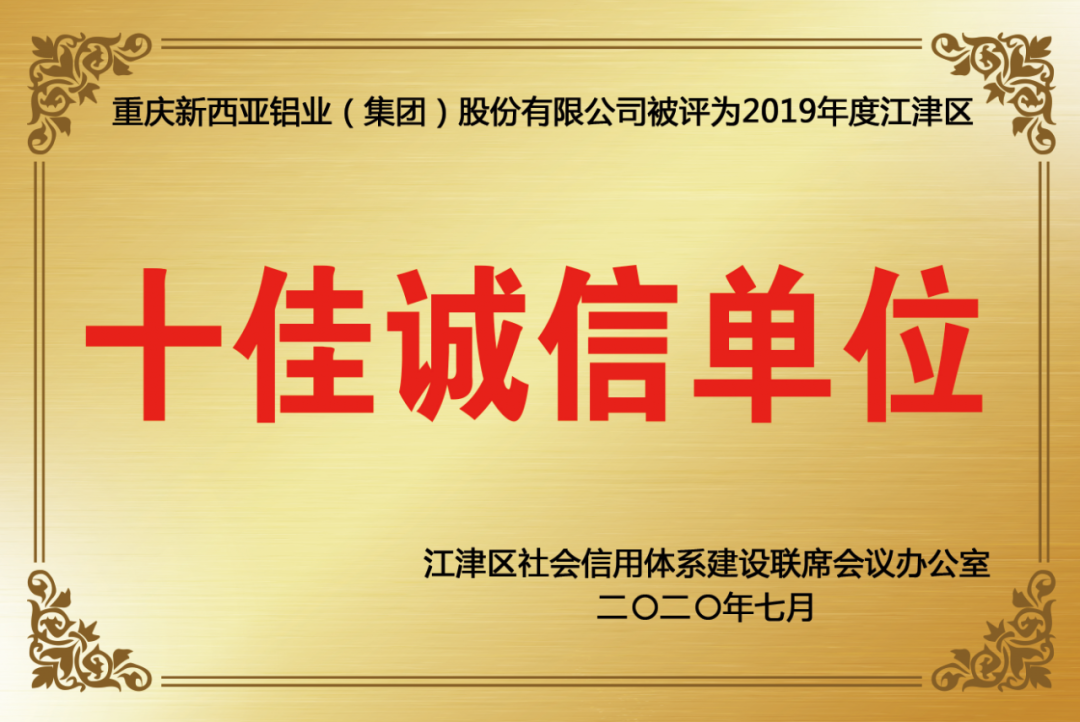為樹立誠信典型,營造誠實守信的社會環(huán)境,7月30日,江津區(qū)十佳誠信典型案例現(xiàn)場發(fā)布會在時代廣場舉行。發(fā)布會上江津區(qū)副區(qū)長唐大軍發(fā)表了重要講話,區(qū)宣傳部長秦敏為受表彰個人與企業(yè)進行了授牌。重慶新西亞鋁業(yè)(集團)股份有限公司獲評“十佳誠信典型案例誠信單位”,劉斌總經(jīng)理率隊出席了會議。