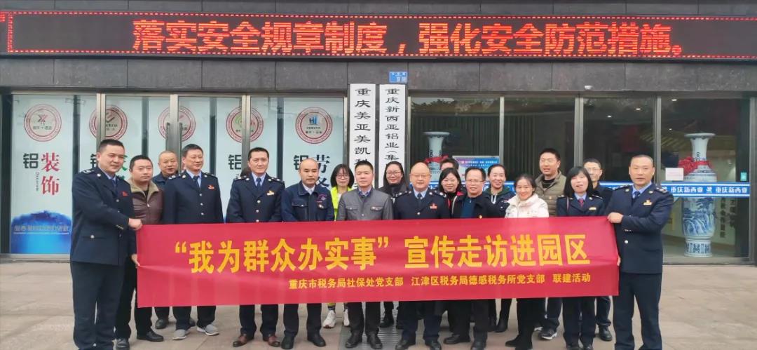 為深入貫徹黨的十九屆六中全會(huì)精神,把脈問診與解決企業(yè)發(fā)展中存在的難點(diǎn)與問題,12月7日,由重慶市稅務(wù)局社保處、重慶市江津區(qū)稅務(wù)局及江津德感稅務(wù)所牽頭組織開展的“我為群眾辦實(shí)事”宣傳走訪團(tuán)走進(jìn)德感園區(qū)部分國有企業(yè)、民營(yíng)企業(yè)進(jìn)行政策宣講與座談交流,座談交流會(huì)在新西亞鋁業(yè)集團(tuán)黨群活動(dòng)室進(jìn)行。
